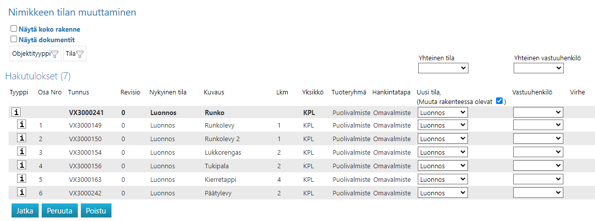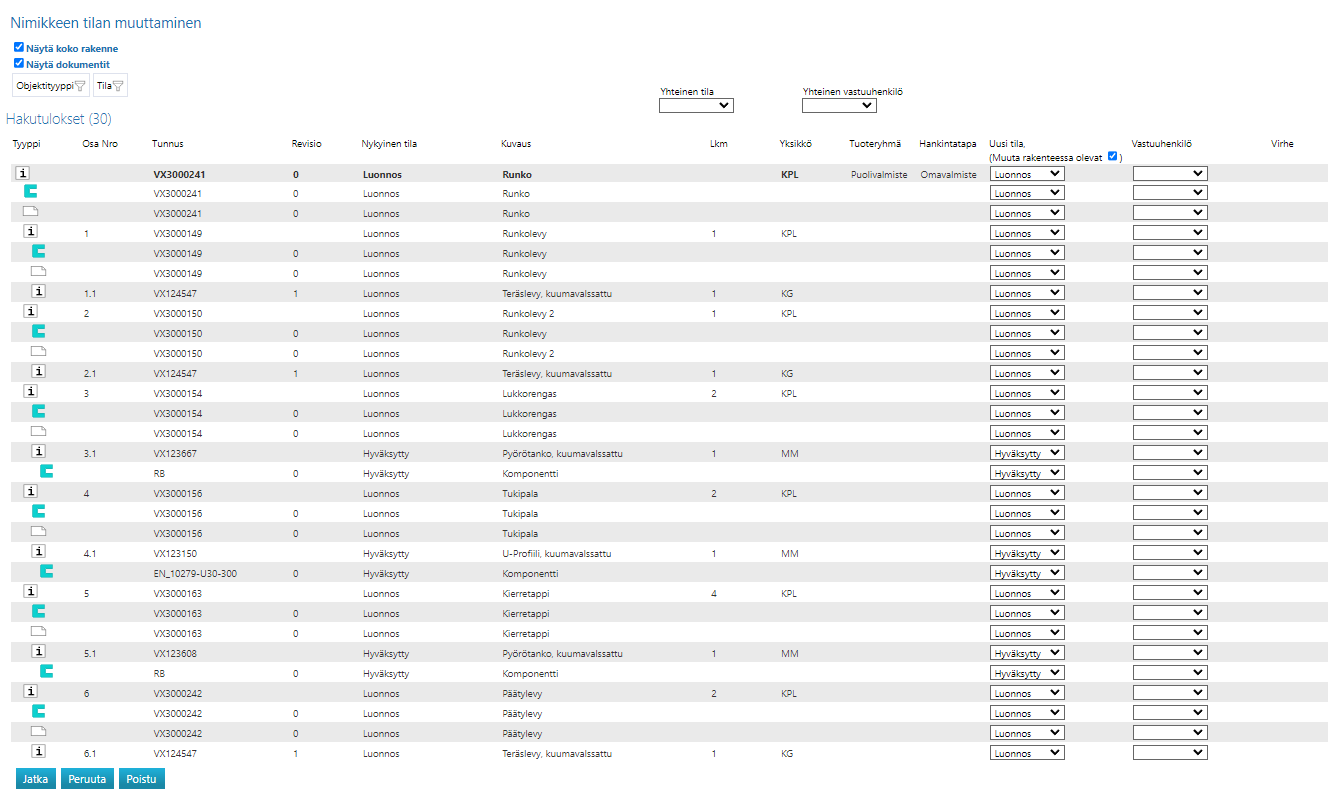 Jos valitsit Muuta rakenteessa olevat, kohdistuu yksittäisen nimikkeen tilan muutos myös sen alinimikeisiin.