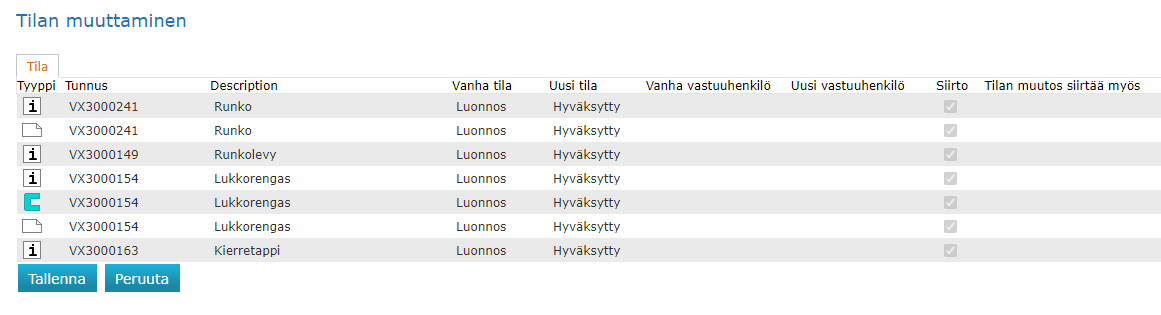 valitse tila mallin tai piirustuksen riviltä, jos haluat muuttaa vain ko. rivillä olevan objektin tilaa.