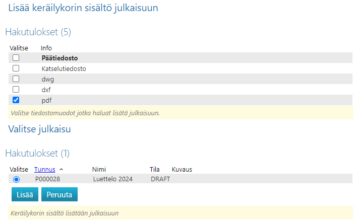 Toiminto edellyttää, että käytössä on lisenssioptio Julkaisujen hallinta ja että julkaisuja on otettu varatuiksi.