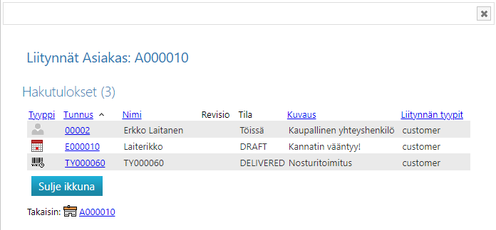 Vaihtoehtoisesti voit valita objektin kohdasta Takaisin XXXXX, jossa XXXXX on objektin tunnus. Tällöin objektin tiedot samalla ladataan uudelleen, joten toiminto vähän hitaampi, kuin toiminto Sulje ikkuna.