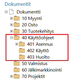 Esimerkki: Tuotteen käyttöohjeeseen liittyvät dokumentit on jaettu luokitteiden avulla kolmeen luokkaan.