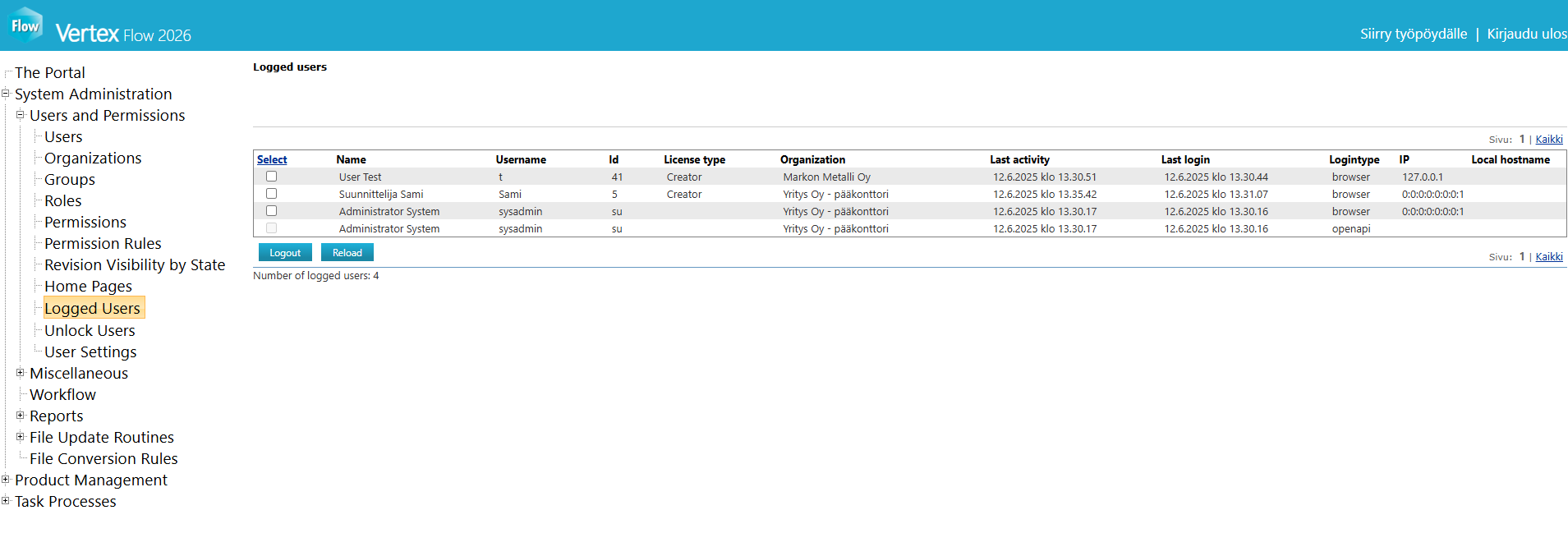 Taulukosta näet kirjautuneiden käyttäjien tietoja.