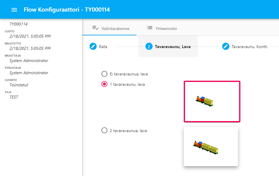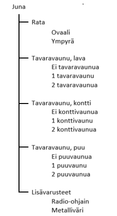 - radiobutton: valintanappi (tässä esimerkissä mm. 1 tavaravaunu, lava)