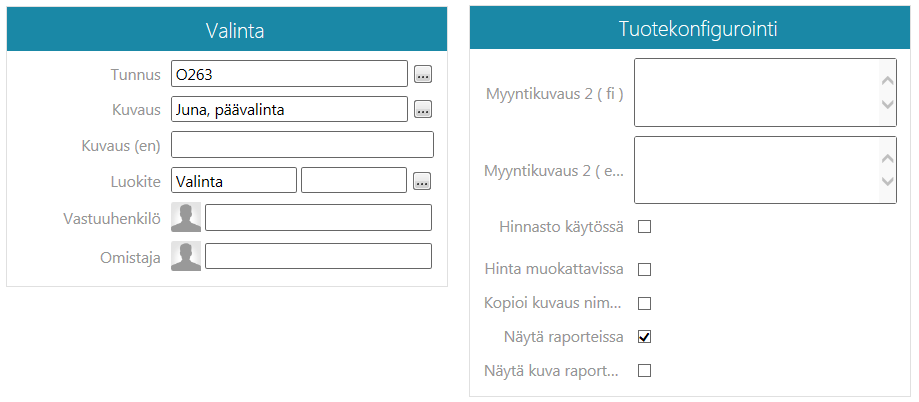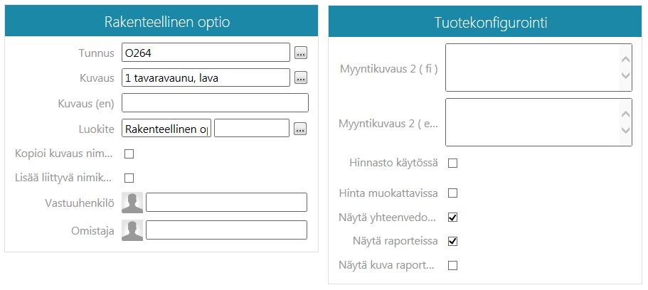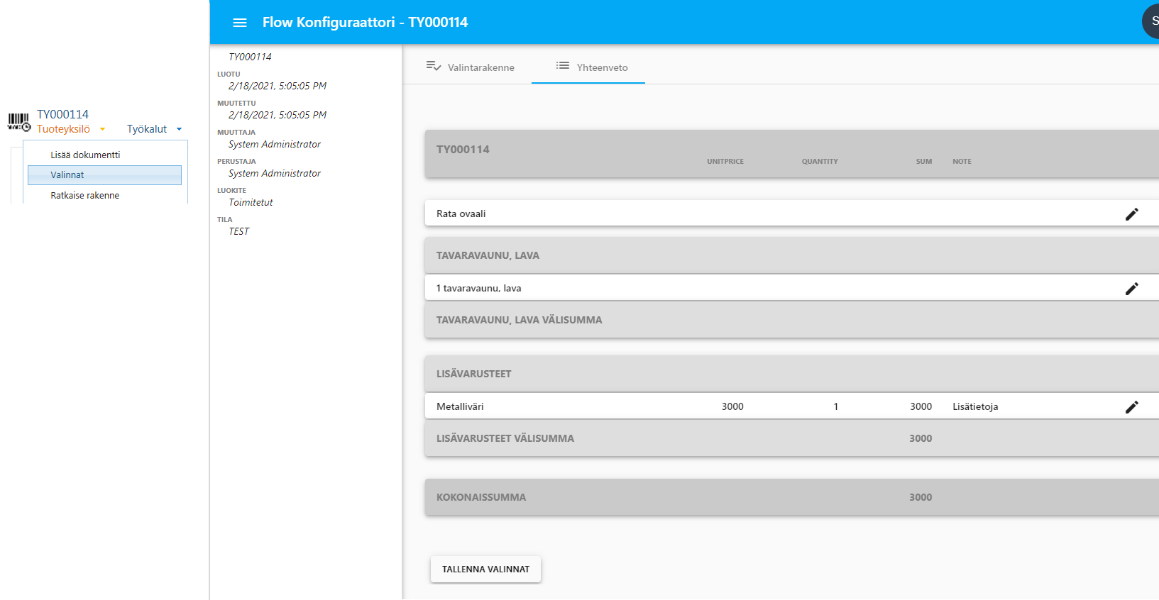 Valintarakenne tehdään vastaavanlaisesti kuin nimikerakenne. Valintarakenne näkyy suoraan myyntikonfiguraattorissa.
