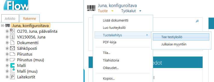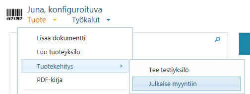 Testausta varten tee tuotteelle testiyksilö (Tuote > Tuotekehitys > testiyksilö). Kun konfiguraattori on todettu toimivaksi, julkaise tuote myynnin käyttöön Tuote > Tuotekehitys > Julkaise myyntiin.