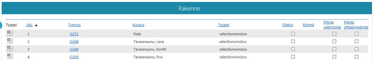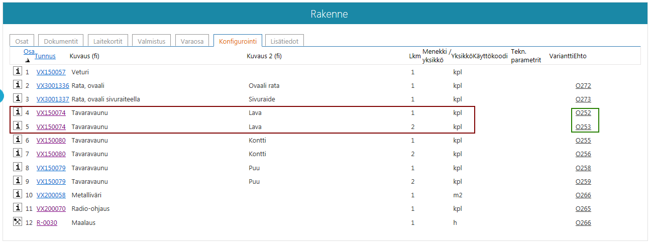 - Ehdot löydät Valintarakenteesta, esim. O251 viittaa valintarakenteen rakenteelliseen optioon 1 tavaravaunu (Lava)