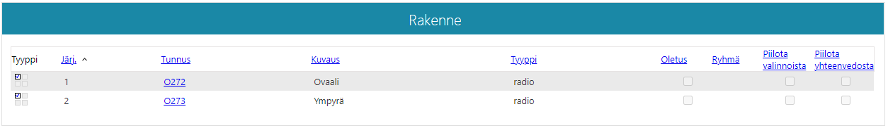 Ryhmä: Kun samassa valinnassa on useita radiobutton-ryhmiä, voidaan määritellä mitkä radiobuttonit kuuluvan samaan ryhmään. Ryhmän sisällä vain yksittäinen valinta voi olla päällä.