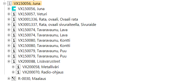 - Kun on kyse samasta osasta, jossa vain lukumäärä muuttuu, rakennerivillä voi esiintyä samoja nimikkeitä, jotka eroavat vain lukumäärä perusteella, esim. Tavaravaunut (kohta 1).