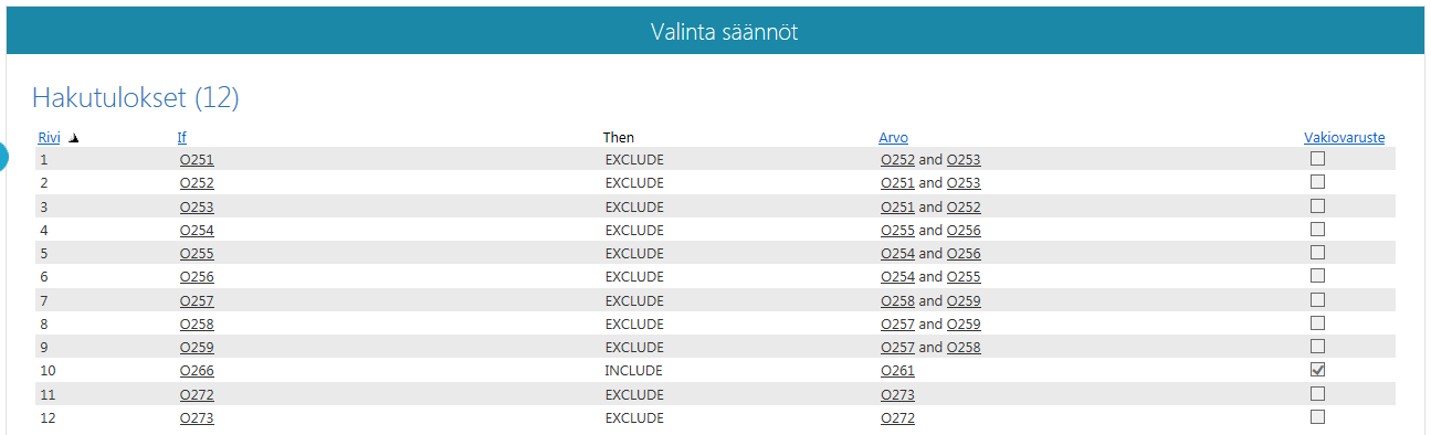 - EXCLUDE = Poistetaan rakenteesta tai valintalistalta. Näkyy harmaana valintalistalla eli valintaa tai rakennetta ei voida valita.