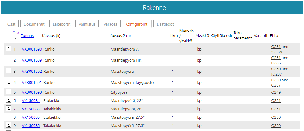 - Rakenteellinen optiot O250 (maastopyörä) ja O287 (Täysjousto) on valittu.