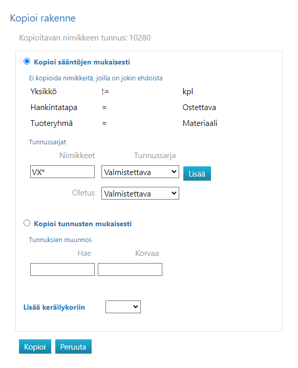 Rakenteen kopioinnilla saat tehtyä tuoterakenteesta kopion niin, että tarvittavat osat saavat uudet tunnukset.