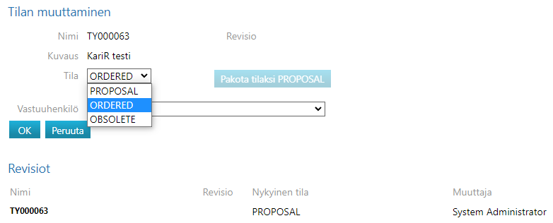 Tarjous muutetaan tilaukseksi muuttamalla tuoteyksilön tila PROPOSAL-tilasta ORDERED-tilaksi.