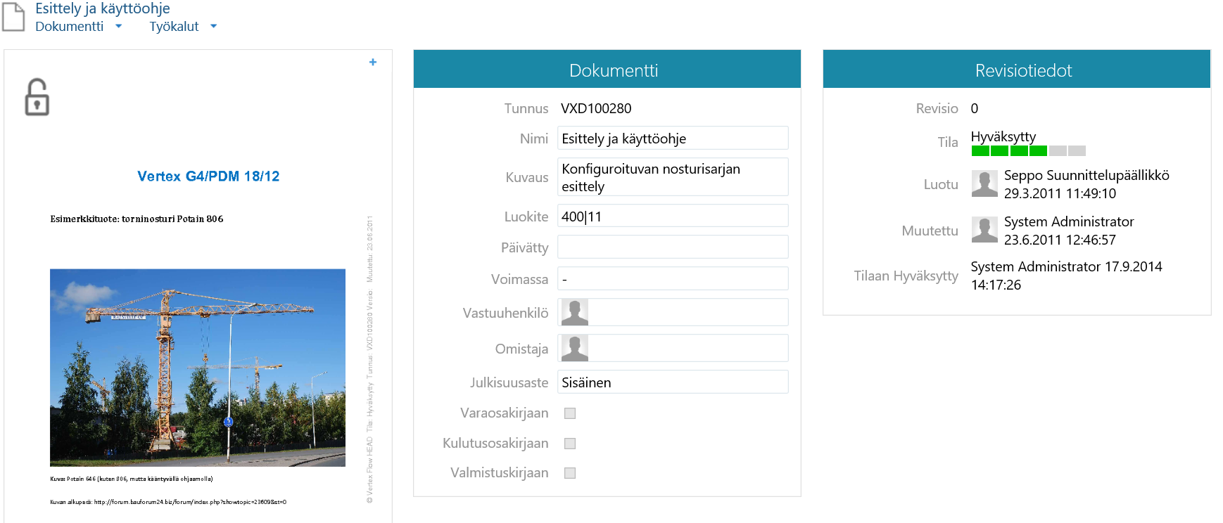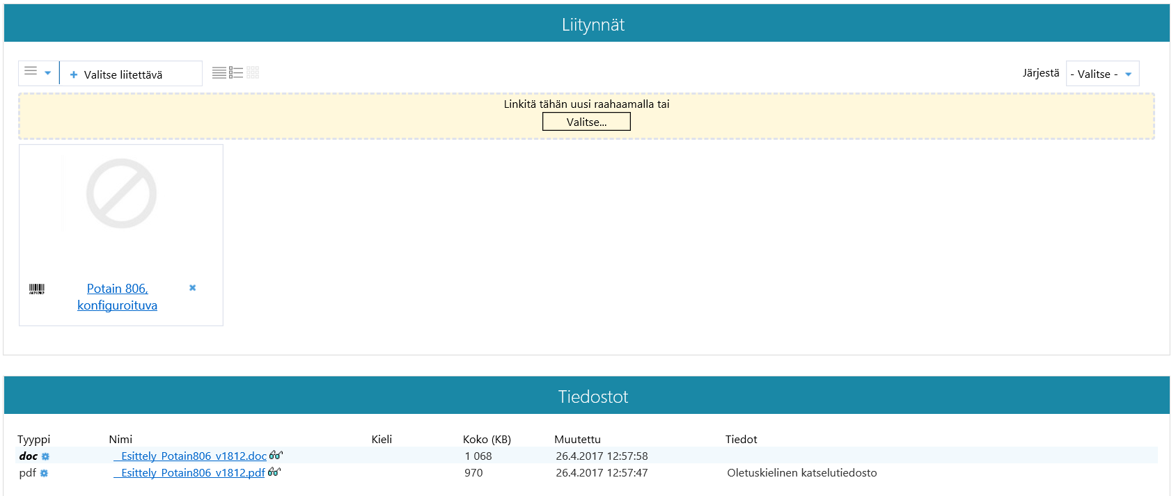 Tiedostot: Tiedostot-kohdassa näkyvät objektiin liitetyt tiedostot. Tällaisiä voivat olla esimerkiksi Office-dokumentit, kuvat yms. Monilla objekteilla on useita tiedostoja: natiivitiedosto, johon muutokset tehdään sekä tästä automaattisesti käännettyjä katselutiedostoja. Valitsemalla näet liitetyn tiedoston tiedot.