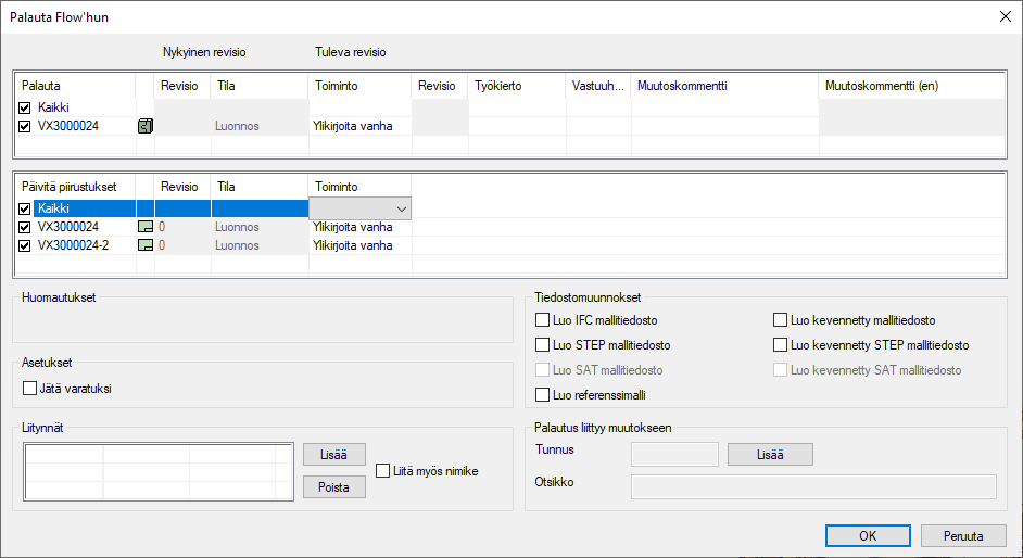 Kun olet tehnyt Vertex G4:llä muutoksia malliin tai kokoonpanoon, jonka piirustukset ovat jo Flow'ssa, voit lisätä piirustukset Flow'n taustakääntäjän päivitysjonoon suoraan G4:n Flow-palautusdialogissa. Piirustukset ovat valittavissa "Päivitä piirustukset"-listanäkymässä "Palauta"-listanäkymän alapuolella. Valitse päivitettävät piirustukset ja suorita palautus loppuun tavalliseen tapaan. Piirustusta ei voi valita päivitettäväksi, mikäli se on varattu, vaan se on vapautettava ennen palautusdialogin avaamista.