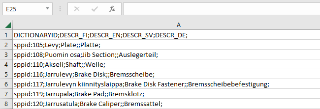 - Älä muokkaa ensimmäisen rivin sisältöä, joka kertoo Flow'ssa olevat sanakirjan kenttien nimet.