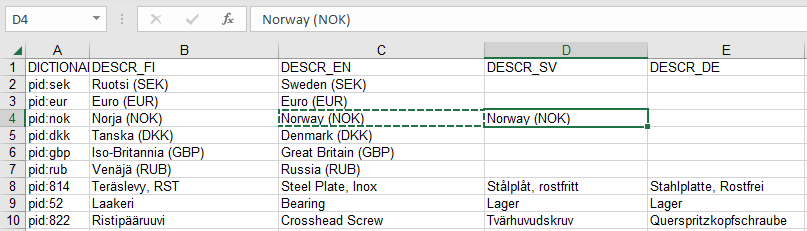 Huomaa: Kun teet muutoksia XLSX-tiedostoon, älä muokkaa saraketta DICTIONANRYID.