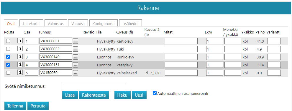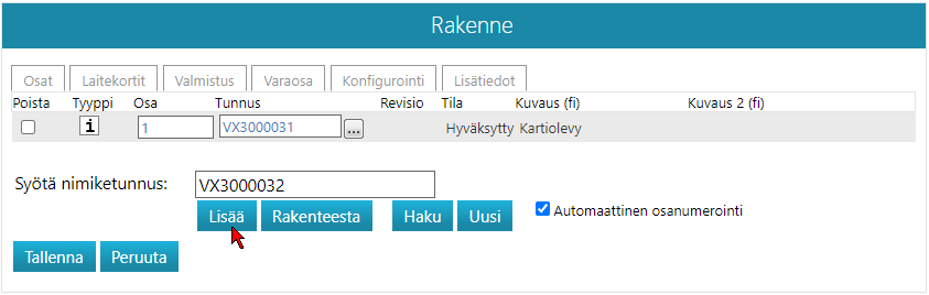 - Ellet valinnut Automaattista osanumerointia, huolehdi itse, että samaan osanumero ei ole kahdella erilaisella nimikkeellä.