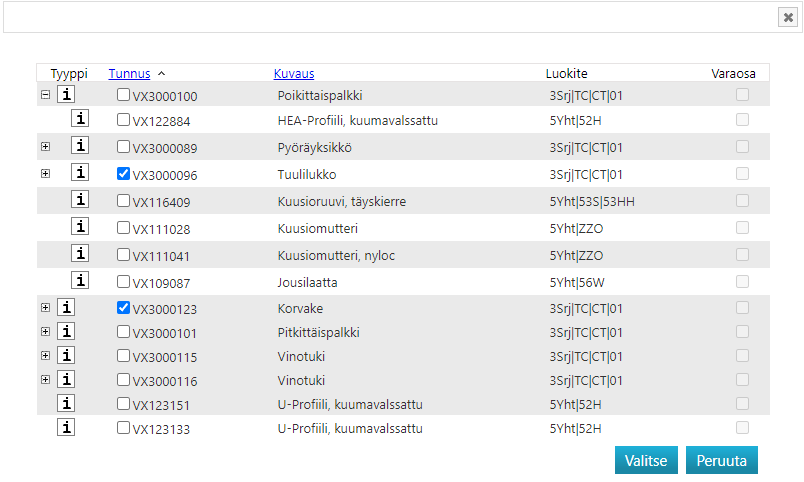 Tällä toiminnolla voit lisätä yhden tai useampia hakutuloksissa olevia nimikkeitä rakenteeseen.