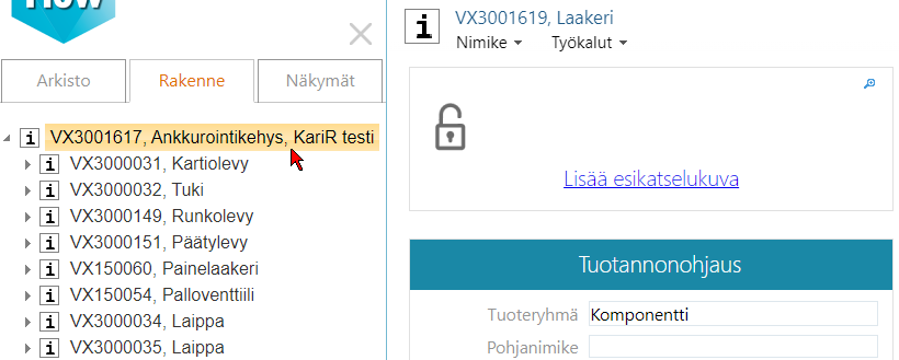 Tässä ohjeessa käsitellään tuoterakenteen eli rakenteellisen nimikkeen rakenteen muokkaamista Flow'ssa.