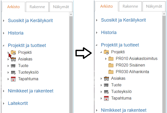 Avaa hierarkiapuusta "Projektit ja tuotteet" ja napsauta projektin edessä olevaa kolmiota