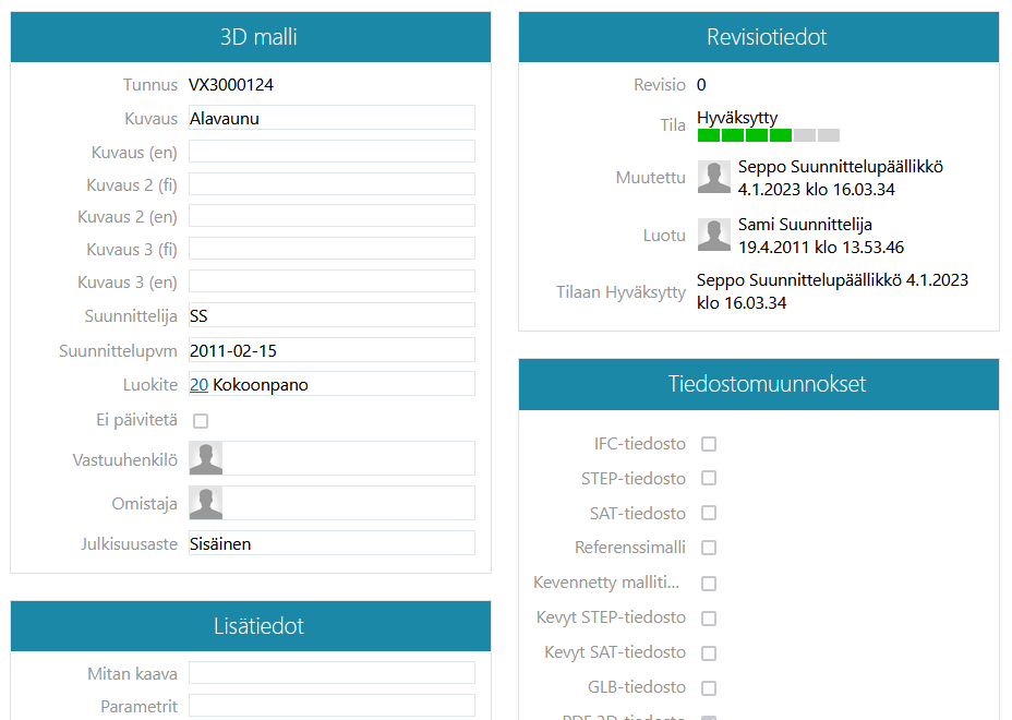 Malleille ja nimikkeille voidaan erikseen selaimella lisätä 3D-katselutiedosto, jonka merkkinä on lohkon oikeassa yläkulmassa oleva 3D-linkki.
