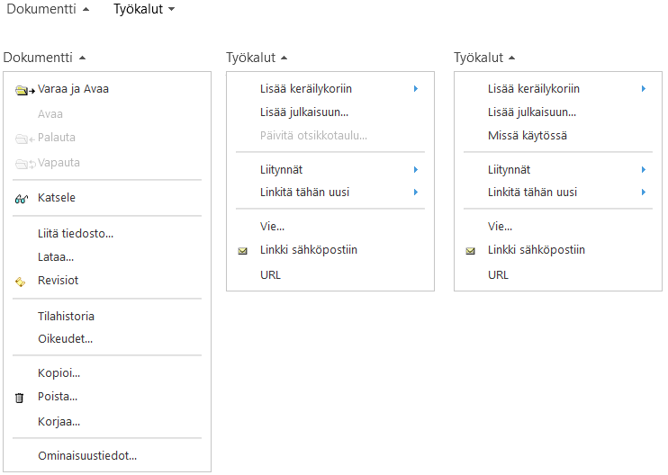 Valikosta avautuu toimintoja, joilla dokumentti voidaan lisätä keräilykoriin tai julkaisuun tai jolla voidaan hallita dokumentin liityntöjä muihin objekteihin sekä vientitoiminnot.