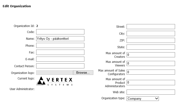Oheisessa kuvassa on näkymä organisaation tietoihin siinä tilanteessa, kun ollaan perustamassa uutta organisaatiota.