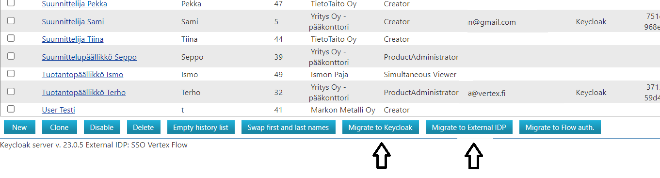 Siirrä käyttäjät Keycloakiin ohjeen "Siirrä useita käyttäjiä uuteen käyttäjähallintajärjestelmään" mukaisesti.
