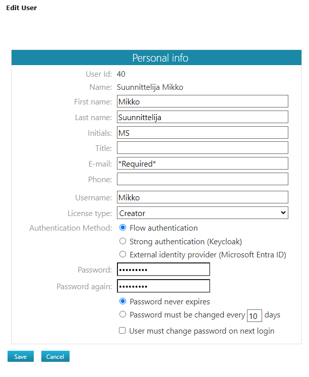 Tällä sivulla ohjeistetaan, miten käyttäjät siirretään vanhasta käyttäjähallinnasta uuteen vakioratkaisuun, jossa käyttäjät hallitaan keskitetysti Keycloakin avulla. Salasanojen turvallisuuden ja sähköpostiosoitteiden varmistuksen takia päivitysohjelma ei voi tehdä siirtoa. Lisäksi ohjeistetaan myös edistyneempi tapa hallita käyttäjät: liittää Flow yrityksen IAM-ratkaisuun eli Identity Provideriin, esimerkiksi Microsoft Entra ID:hen, mutta ensin käyttäjät on siirrettävä Keycloakiin.