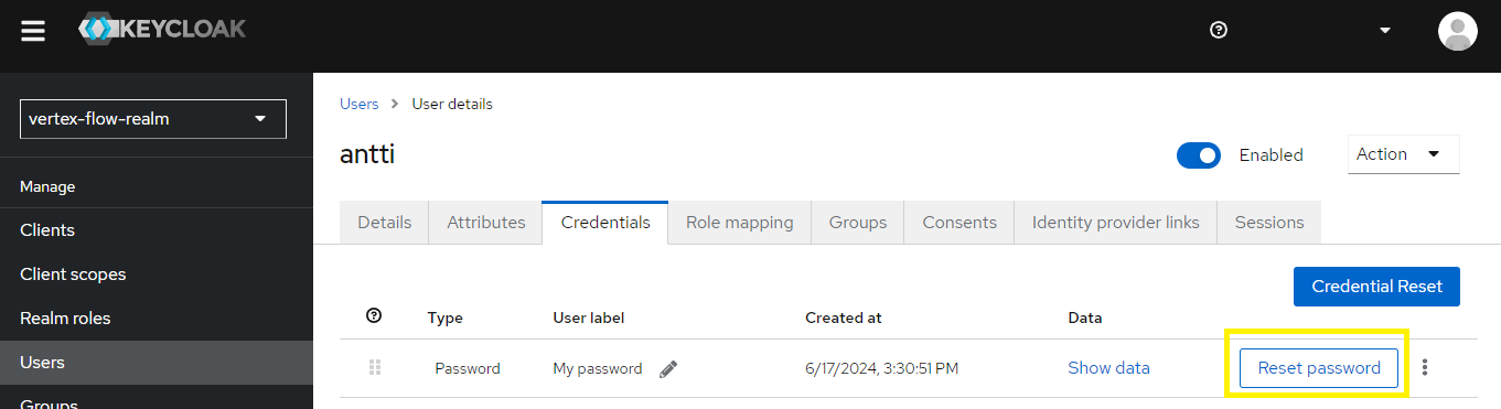 Voit admin-käyttäjänä tarkistaa, onko käyttäjä päivittänyt tilinsä Keycloakissa. Valitse realm Vertex Flow ja sivu Manage > Users. Sähköpostiosoite-sarakkeen huutomerkki kertoo vahvistamattomasta sähköpostiosoitteesta. Jos huutomerkkiä ei ole, käyttäjä on vahvistanut osoitteensa, mutta salasanan päivittämiseen se ei ota kantaa. Salasanan päivittymisajankohdan näet käyttäjäkohtaiselta Credentials-välilehdeltä.