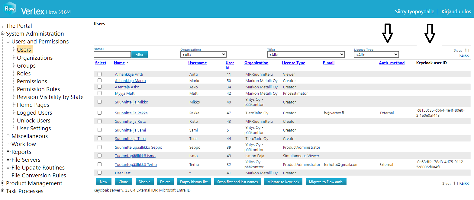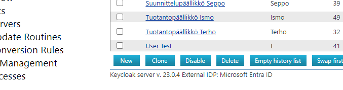 Käyttäjälistauksen alareunassa (ks. edellinen kuva) on uuden käyttäjähallintatavan mahdollistaman Keycloak-osuuden versionumero. Sen perässä on mahdollinen ulkoisen Identity Providerin nimi. Jos nämä puuttuvat, konfiguroinnissa on puutteita. Ota silloin yhteys Vertex-tukeen.