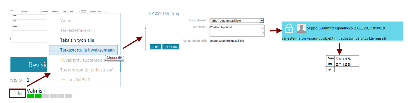 Vaihdat selaimella piirustuksen tilan (napsauttamalla kenttää Tila) tarkastetuksi ja lähetät sen hyväksyttäväksi.