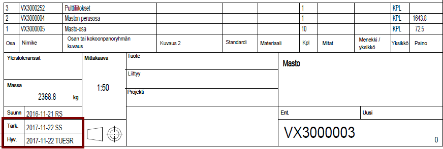 Tällä sivulla esitetään toimitusjärjestelmän standardin mukainen työkierto, jossa piirustuksen otsikkotauluun tarvitaan suunnittelijan nimikemerkkien lisäksi myös tarkastajan ja hyväksyjän tiedot.