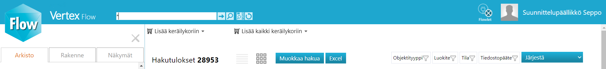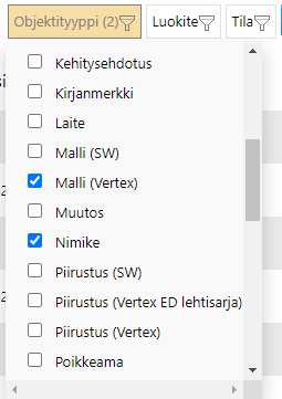 - Esimerkiksi Objektityyppi: Malli ja Nimike, Tila: Luonnos ja Valmis, Tiedostopääte (dokumentit).