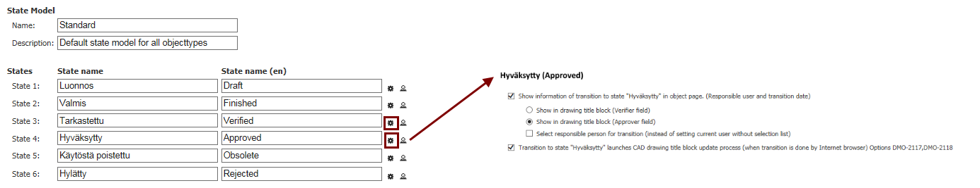 Valitse tilat, joihin siirryttäessä haluat piirustuksen otsikkotaulun päivittyvän automaattisesti. Valitse Portal > System Administration > Workflow > tilamallin nimi (tässä Standard) > Tilan ominaisuudet (Set State properties). Ohjelmistotoimittajan esimerkkitilakaaviossa otsikkotaulun halutaan päivittyvän, kun piirustus siirtyy Tarkistettu- tai Hyväksytty tilaan. Alla olevassa kuvassa on esitetty Hyväksytty-tilan asetukset.
