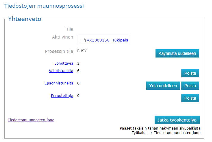 Voit seurata otsikkotaulun päivityksen etenemistä Arkisto -välilehdeltä valitsemalla Työkalut > Tiedostomuunnosten jono. Avautuvasta dialogista voit seurata itse käynnistämiesi päivitysten etenemistä.