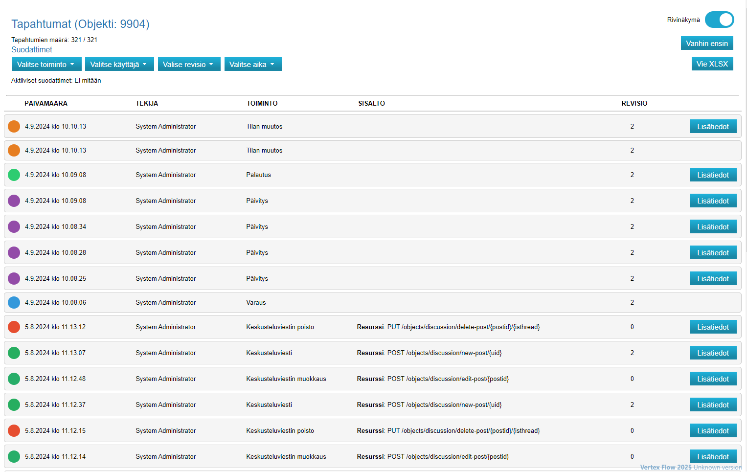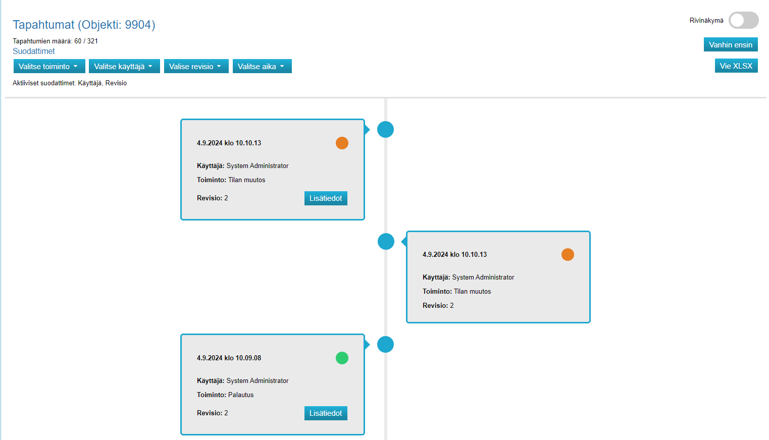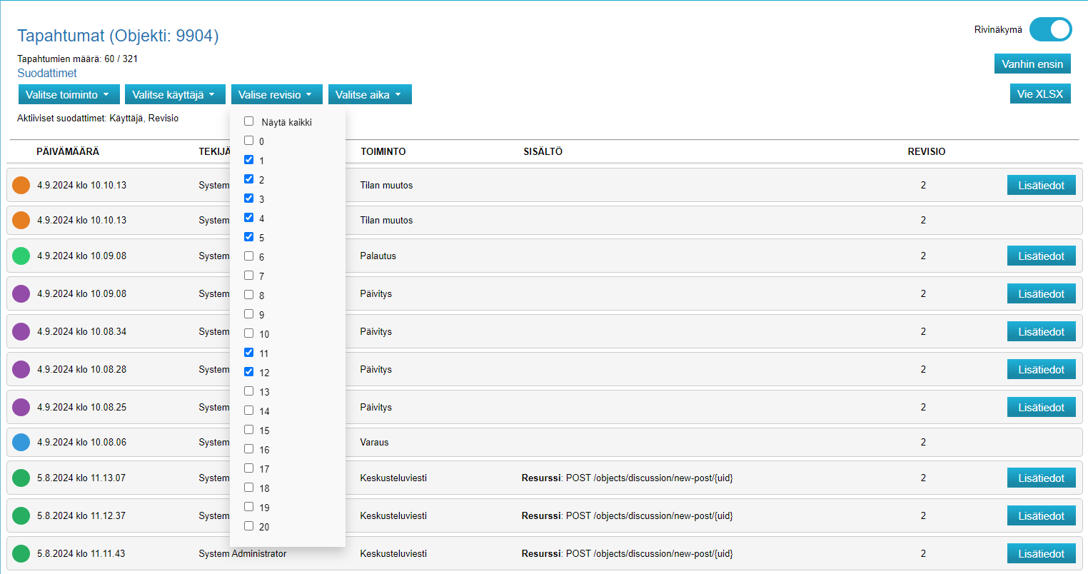 Tapahtumia pystyy suodattamaan käyttäjän, toiminnon, revision ja tapahtumahetken perusteella.