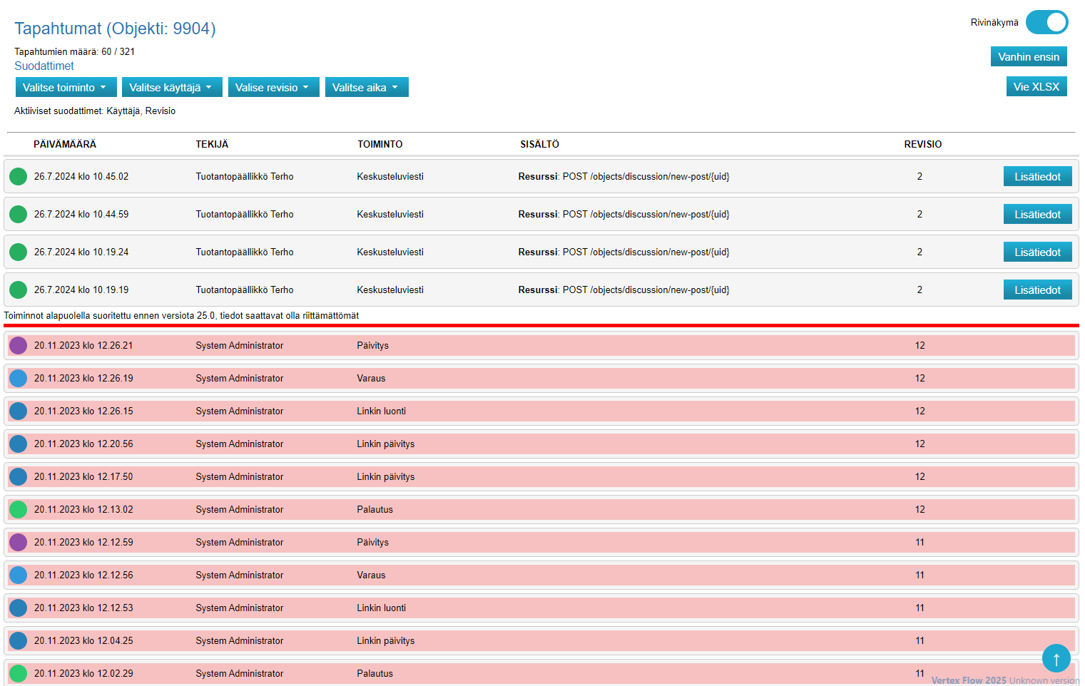 Aikajanalla näkyy ns. vanhoja tapahtumia. Näillä tarkoitetaan ennen versiota 25.0 syntyneitä tapahtumia.