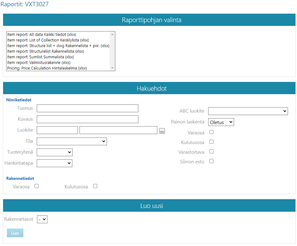 - Huom.: Hakuehto-kentillä voit rajata raportin sisältöön vain esimerkiksi Materiaali-nimikkeet (Tuoteryhmä-valinta).