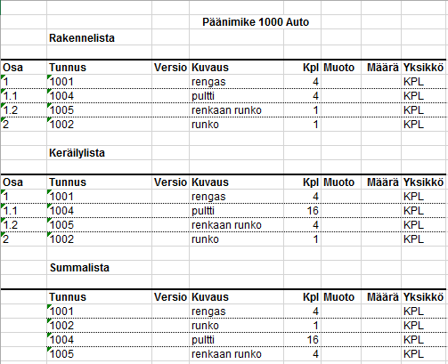 - Nimikkeen osaluettelo eli rakennelista