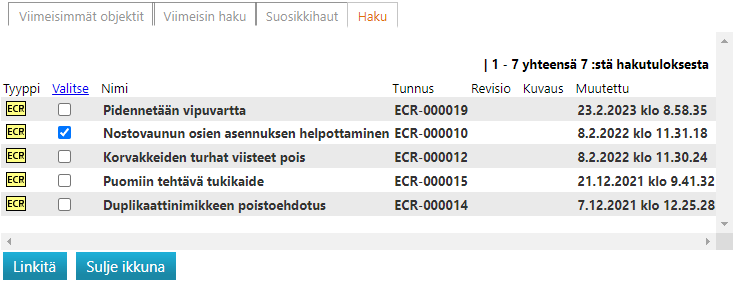 (8.2) Valitse objektityyppi, josta haluat hakea liitettävää objektia.