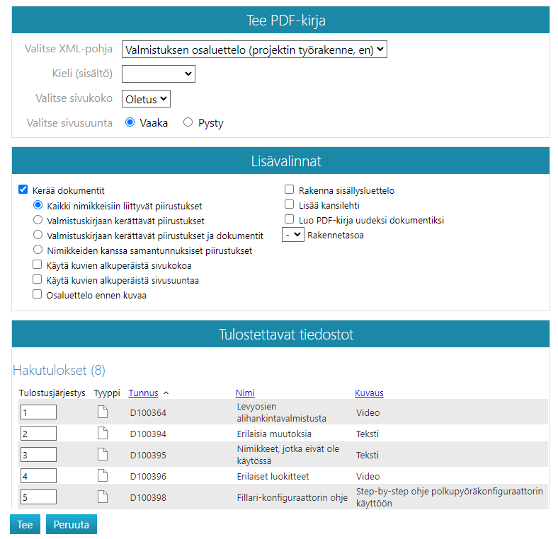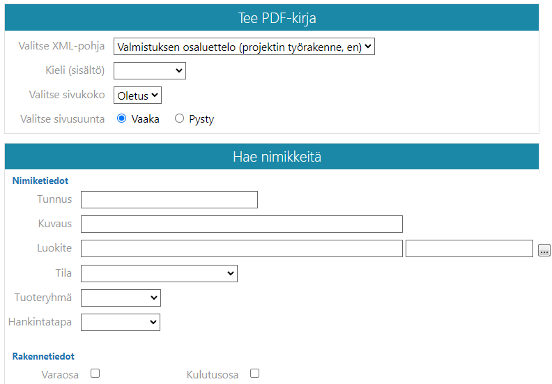 Syötä tai valitse hakuehtoja, joilla suodatat nimikkeet, joiden perusteella PDF-kirja tehdään.