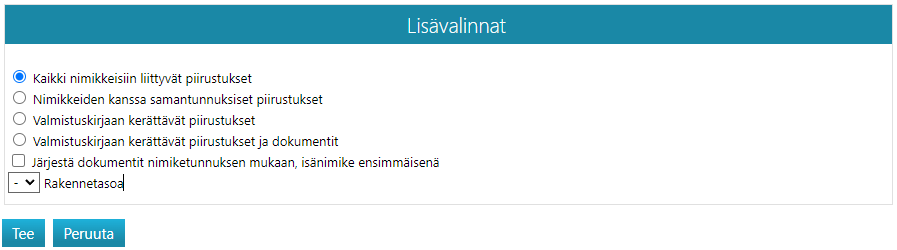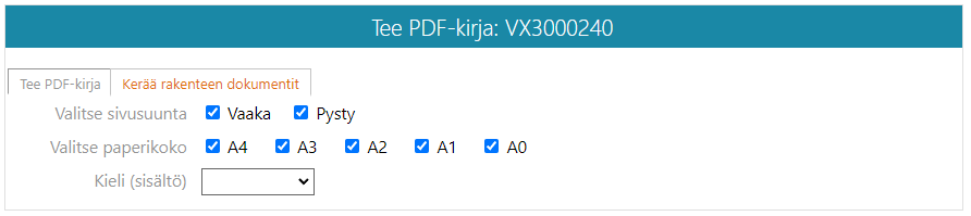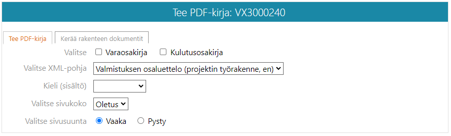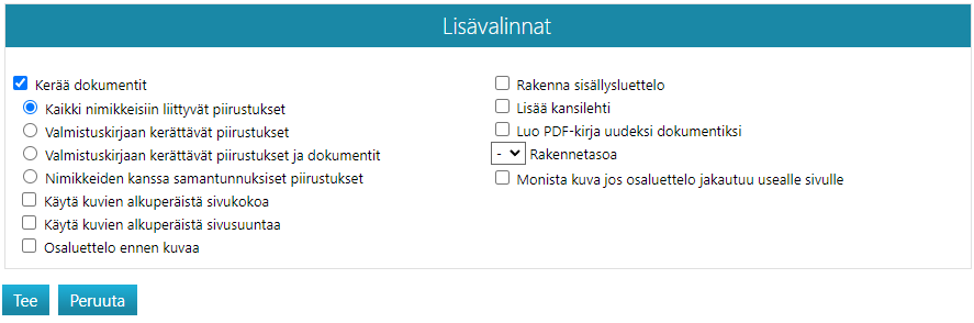 Toiminnolla voit kerätä nimikerakenteesta PDF-kirjaksi erilaisia osaluetteloita, esimerkiksi varaosakirjan tai valmistuksen osaluettelon tai voit kerätä rakenteeseen liittyvät dokumentit PDF-tiedostoksi.