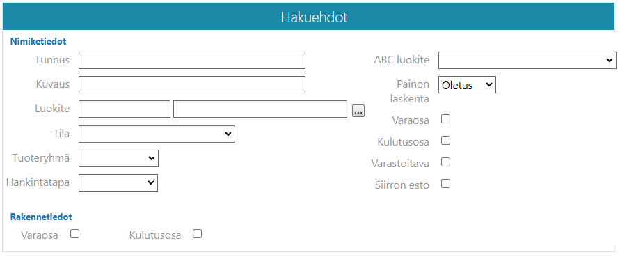 (7) Syötä tai valitse tarvittaessa hakuehdot, joiden perusteella nimikerakenteesta valitaan PDF-kirjaan tuleva aineisto.