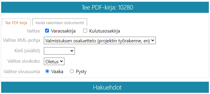 - Flow avaa keskusteluikkunan Tee PDF-kirja, jossa on kolme lohkoa: Tee PDF-kirja, Hakuehdot ja Lisävalinnat.
