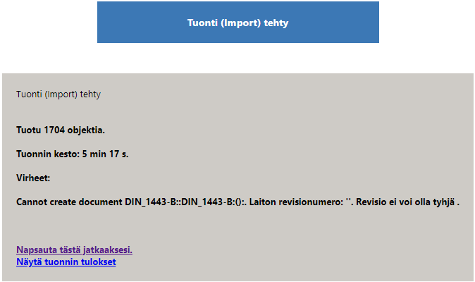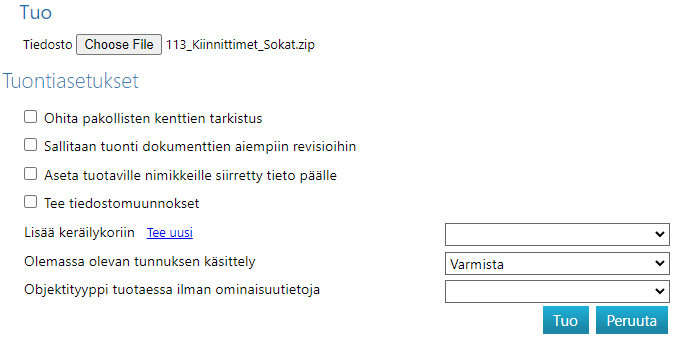 - Normaalisti tuonnissa tarkistetaan, että pakolliset kentät ovat tuontitiedostossa mukana, esim. luokite ja kuvaus.