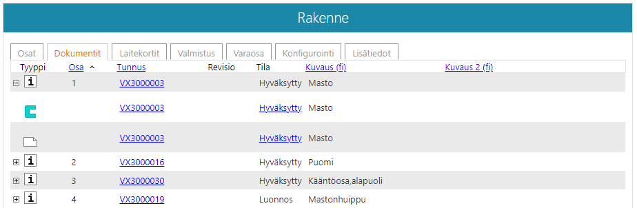 Välilehdellä voit tarkastella, mitä dokumentteja rakennerivin osalle on liitetty. Myös tekstidokumentit näkyvät