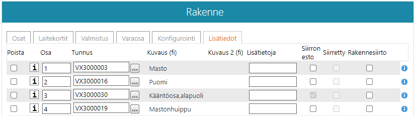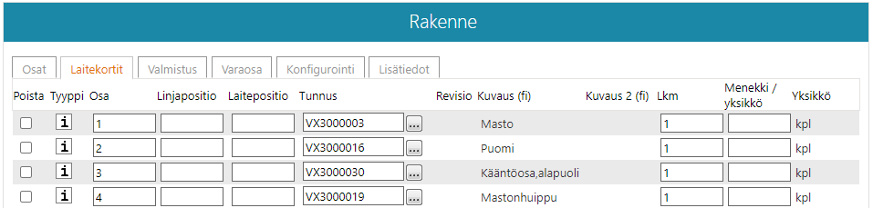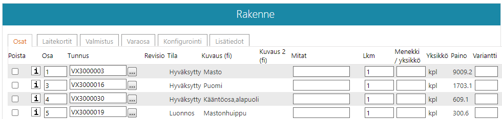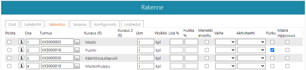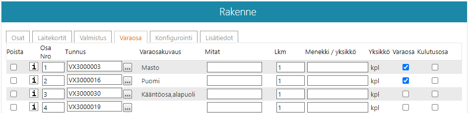 Valmistusrakenteesta tämä poikkeaa siten, että varaosana ja kulutusosana toimitettavat osat ”korva-merkitään” ao. sarakkeeseen rastitettavalla valintaruudulla.