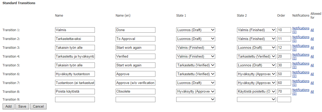 Tilasiirtymät-dialogin Allowed for -linkistä voit määrittää käyttäjäryhmät/ryhmät, joilla on oikeus tehdä ko. tilasiirtymä.