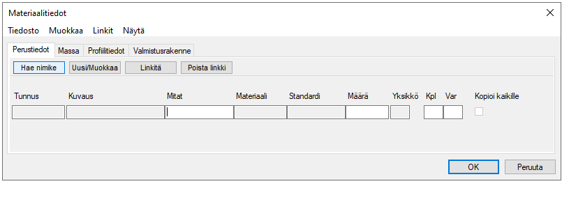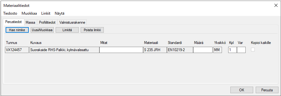 - Mitat-kentässä voi olla esim. profiilin pituus tai levyaihion päämitat, jos laskentayksikkö on esim. mm, m tai m2.